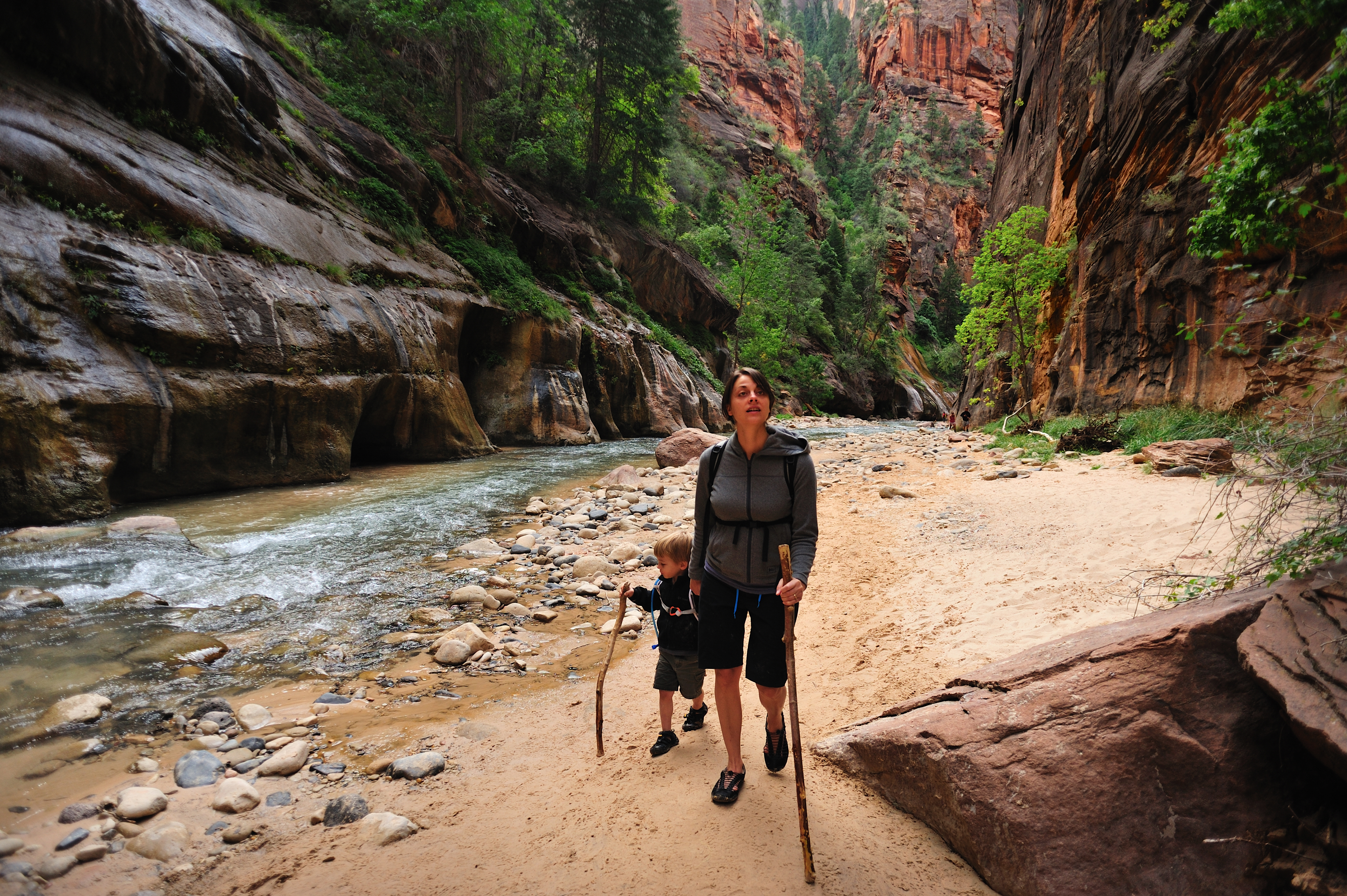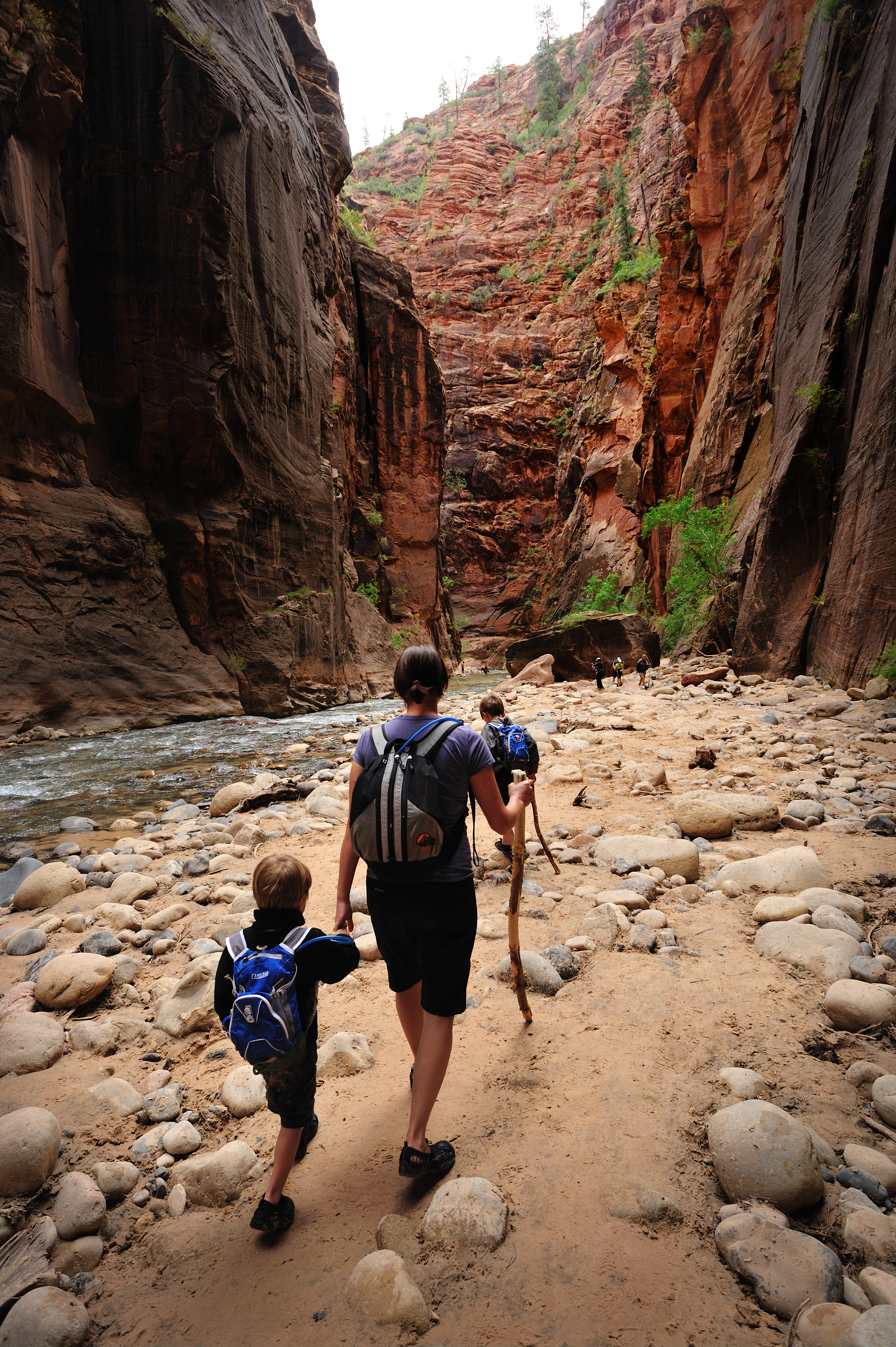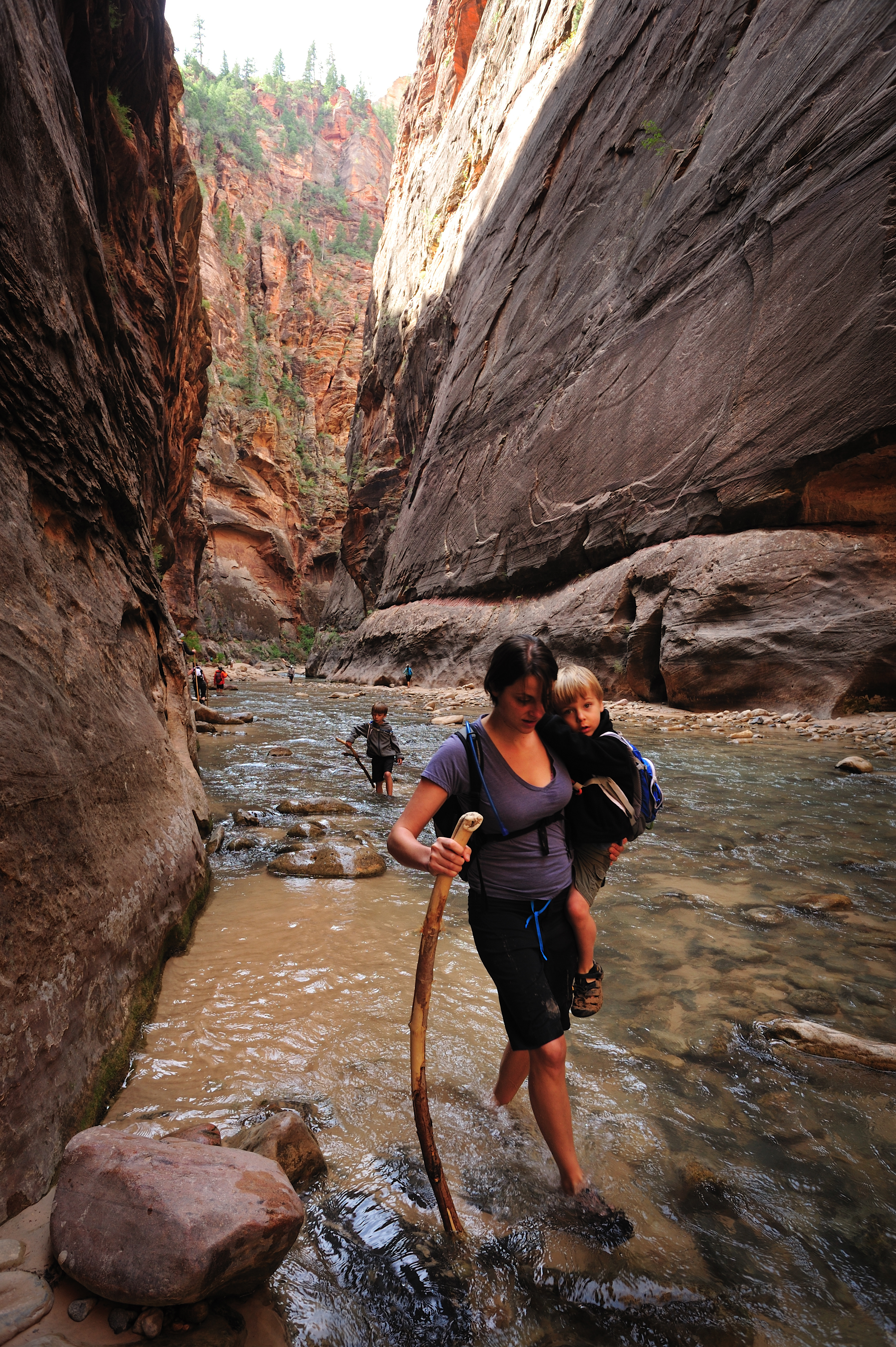 I have been to Zion 5 or 6 times over the years and have never been able to hike the Narrows, due to weather. This time we made it our mission to be able to do it. It was a great hike through the narrow canyon up the Virgin River. Isaac made short work of it leaving us behind. The water was a bit too deep for Adam; Jess carried him over the water and let him walk when there was a beach. She did this most of the way; I offered to trade her my camera gear for him but she declined saying she would rather it be me who fell in the river damaging my equipment than her.