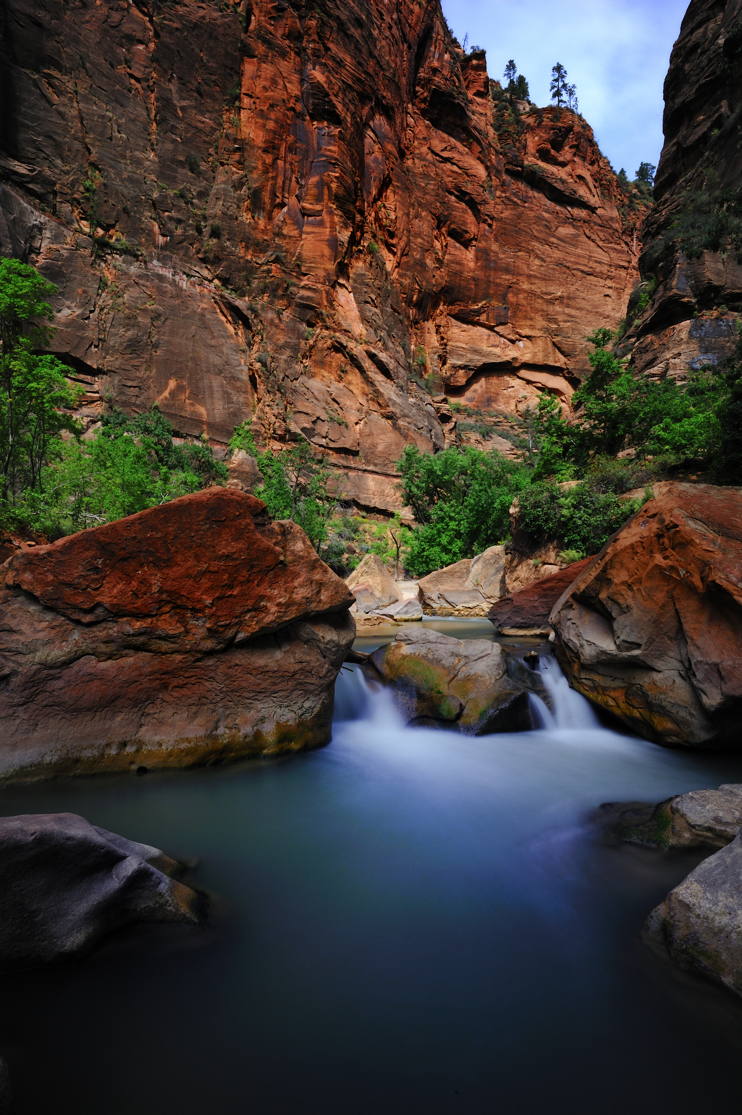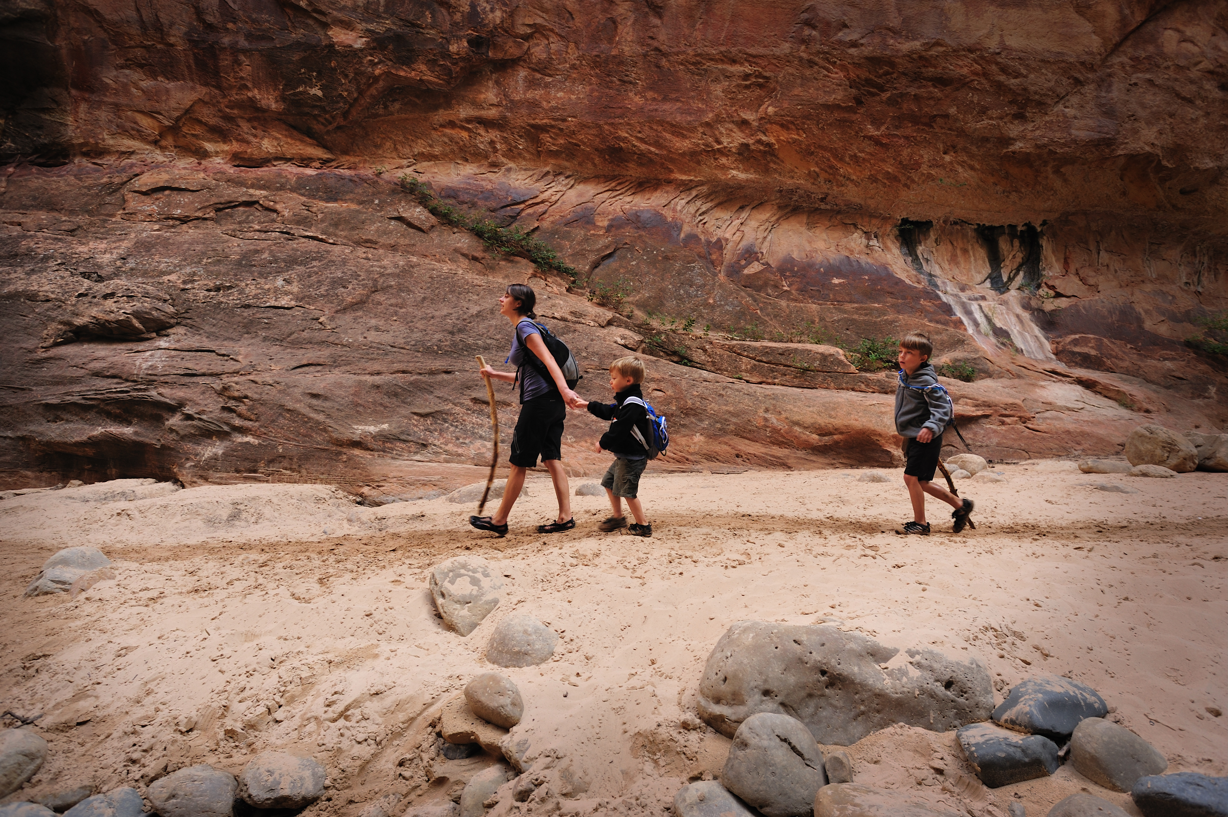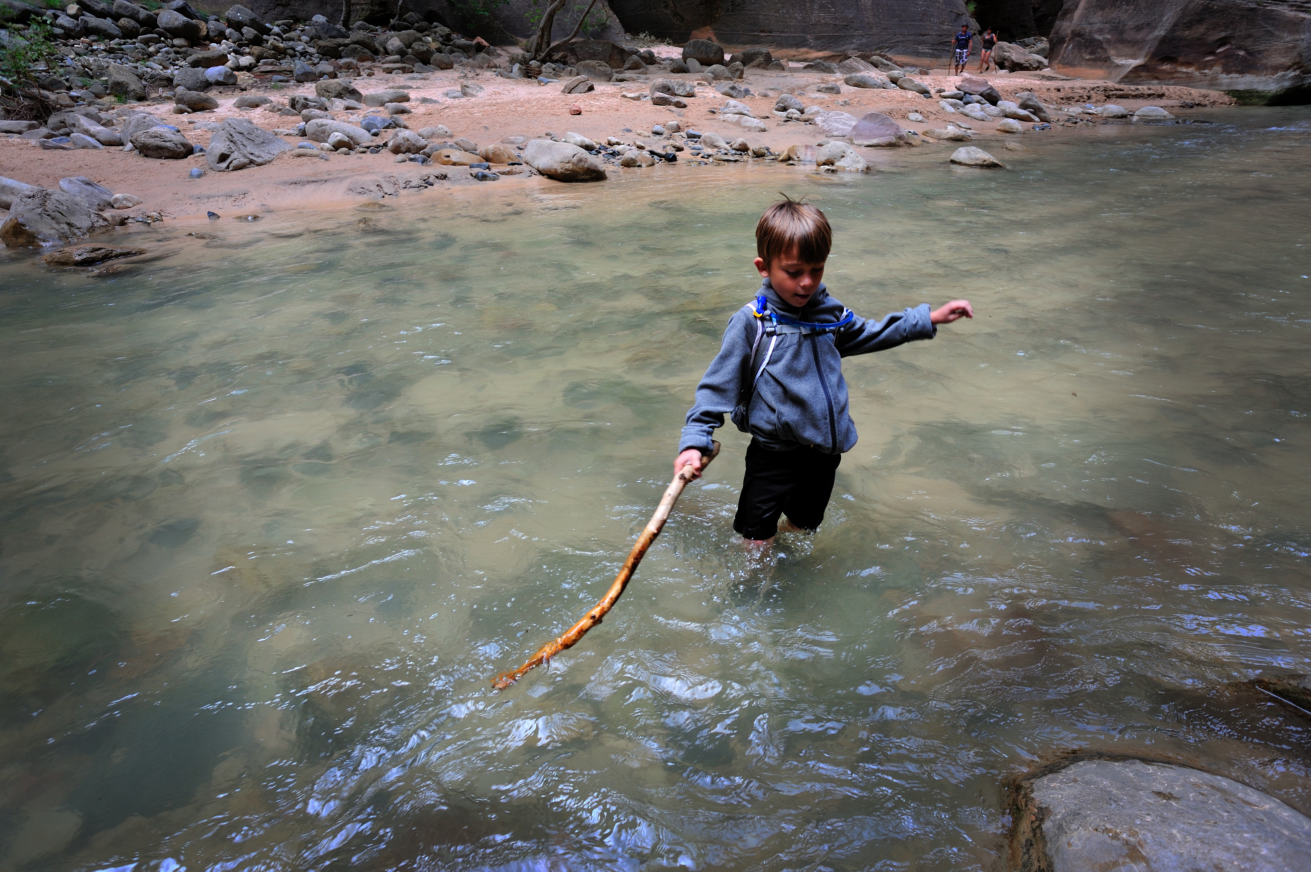 I have been to Zion 5 or 6 times over the years and have never been able to hike the Narrows, due to weather. This time we made it our mission to be able to do it. It was a great hike through the narrow canyon up the Virgin River. Isaac made short work of it leaving us behind. The water was a bit too deep for Adam; Jess carried him over the water and let him walk when there was a beach. She did this most of the way; I offered to trade her my camera gear for him but she declined saying she would rather it be me who fell in the river damaging my equipment than her.